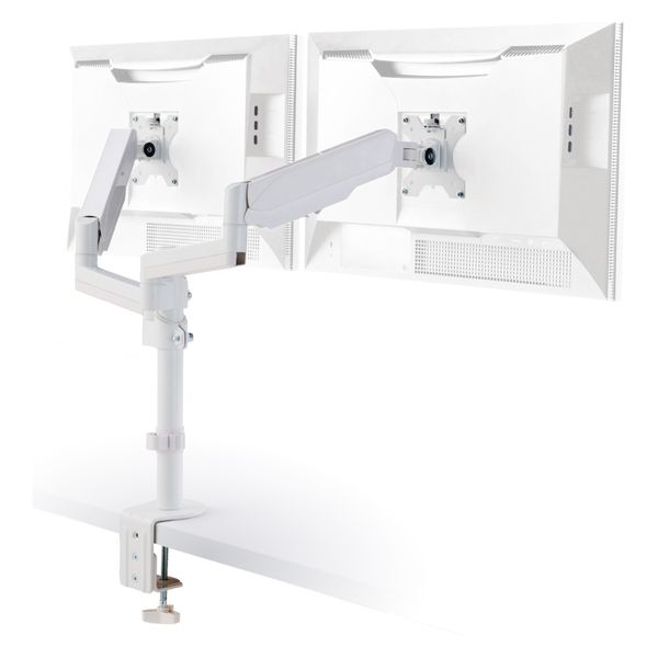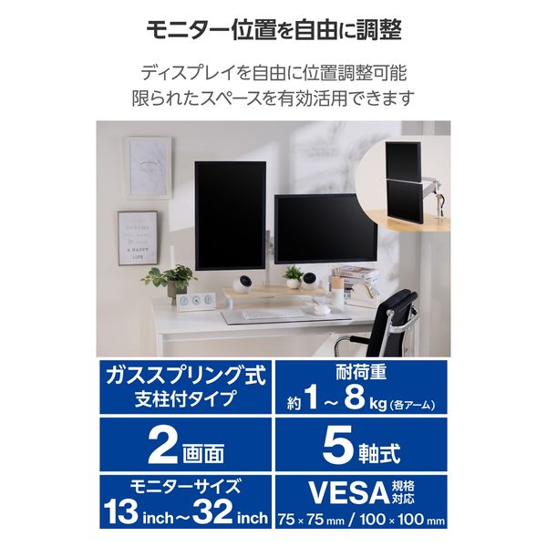 モニターの位置を自由に調整でき、デスクのスペースを有効活用!13~32インチサイズのモニターを2台設置できる、支柱付きのガススプリング式で軽い力で動かせる。可動域の広い5軸可動のアームタイプで、高さが調節しやすい支柱付きです。 VESA規格(75mm×75mm、100mm×100mm)に準拠したモニターです。グロメット式(10-80mm)とクランプ式(10-80mm)両方に対応。